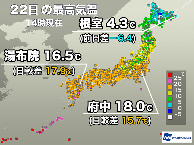 14時までの最高気温は15℃を超えた所がほとんどで、鹿児島市では20.2℃を観測しています。内陸部では朝と昼間の気温差が大きく、大分県湯布院町は最低気温が−1.4℃、最高気温が16.5℃でその差は17.9℃です。東京都府中市でも日較差は15.7℃に達しました。