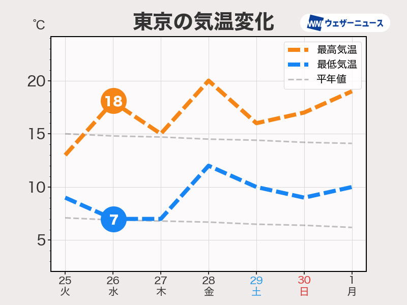 東京は26日(水)に11℃の気温差が予想されています。