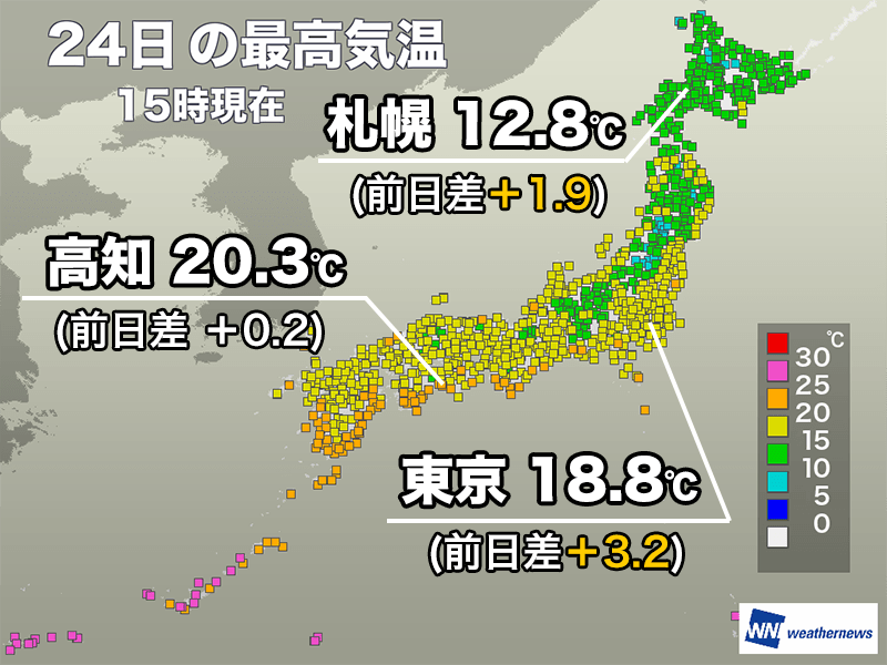 15時までの最高気温は東京都心で昨日よりも3.2℃高い18.8℃、大阪市は19.1℃、高知市では20.3℃を観測しました。札幌市も昨日より2℃近く高い12.8℃と11月上旬並みになっています。