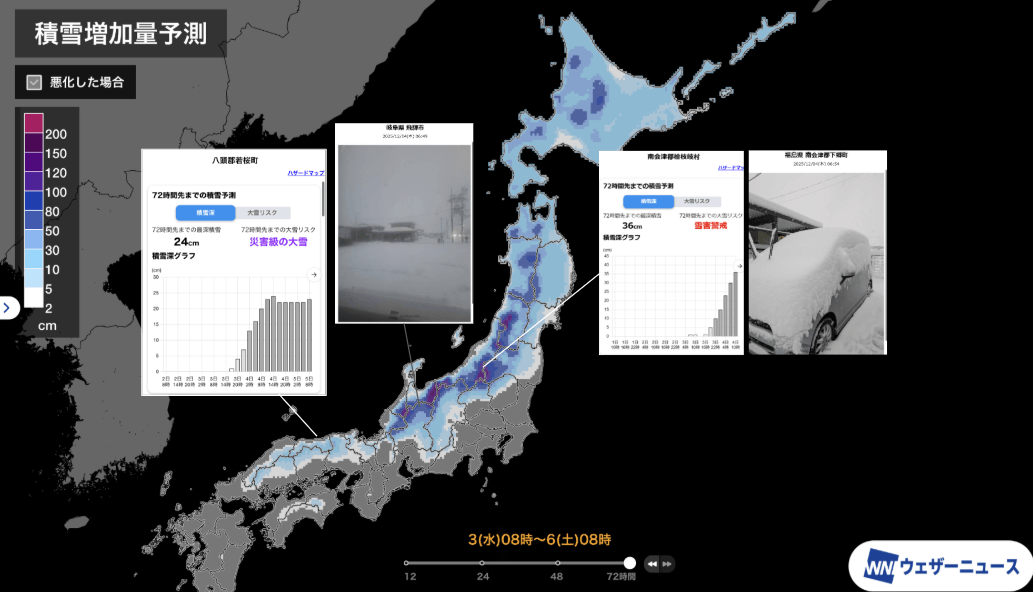 特に3日(水)夜間は、上空5500m付近で-36℃以下の大雪をもたらす強い寒気が通過し、積雪が増えました。東北~北陸の日本海側の山沿いでは、12時間で50cmを超える降雪となり、初冬季にも関わらず一気に積もったところもありました。カナダの都市よりも年間降雪量の多い青森県酸ヶ湯では、5日夜までの間に積雪深が1mを超えました。