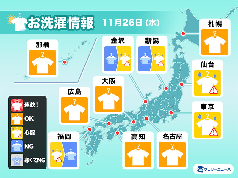 北日本や北陸、山陰では雨や雪が降る所が多く、洗濯物の外干しは厳しそうです。今週はあいにくの天気が続くため、乾燥機の活用や部屋干しをおすすめします。