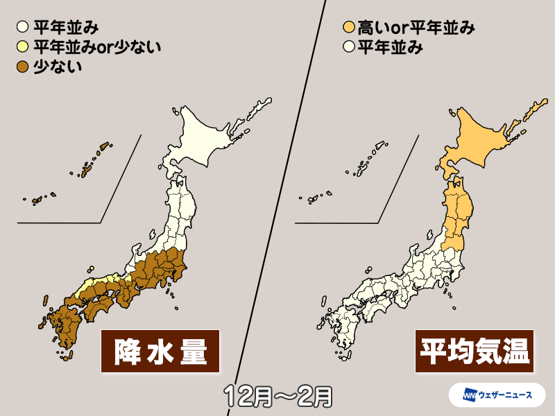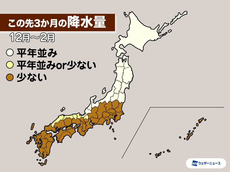 一方、低気圧の影響を受けにくい関東から西の太平洋側は少ない予想で、特に12月は降水量が少なくなるとみられます。空気が乾燥しやすいため、火災や感染症などへの注意が必要です。