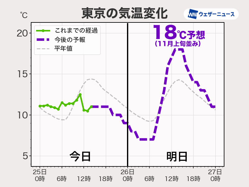 昼間は今日より大幅に気温が高くなり、日差しの温もりが感じられそうです。夜は風が冷たくなってくる見込みです。