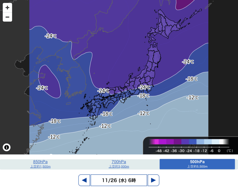 今夜は低気圧が東海上で発達し、上空の寒気が明日26日(水)の午前中にかけて日本列島の上空を通過します。