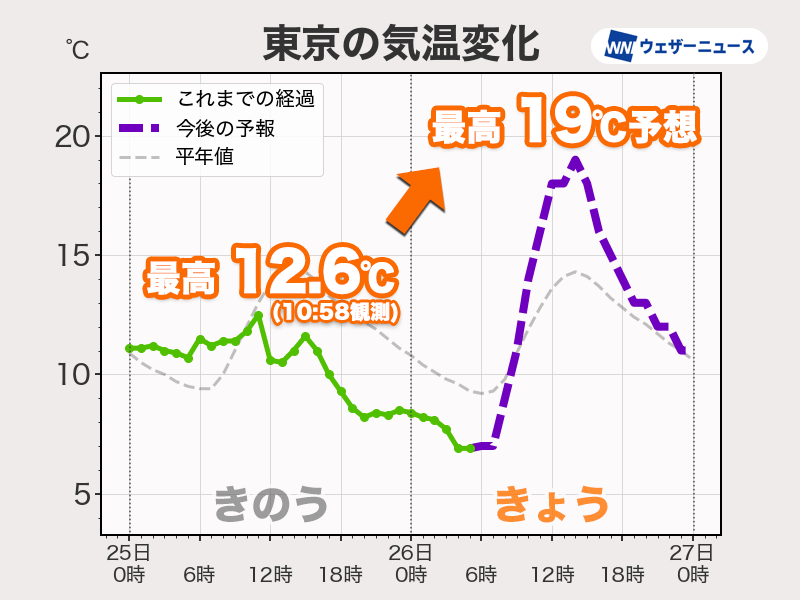昼間は昨日より大幅に気温が高くなり、日差しの温もりが感じられそうです。夜は風が冷たくなってくる見込みです。