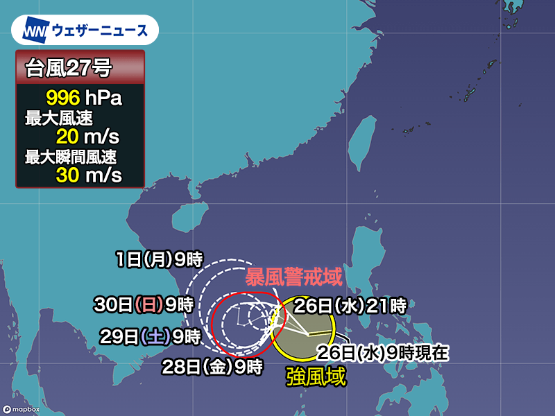 台風27号は今後も西進して南シナ海でやや発達し、一時的に暴風域を伴う可能性があります。その後は来週にかけてほとんど停滞する見込みです。フィリピンでは台風の中心が離れたあともしばらく大雨に注意が必要となります。