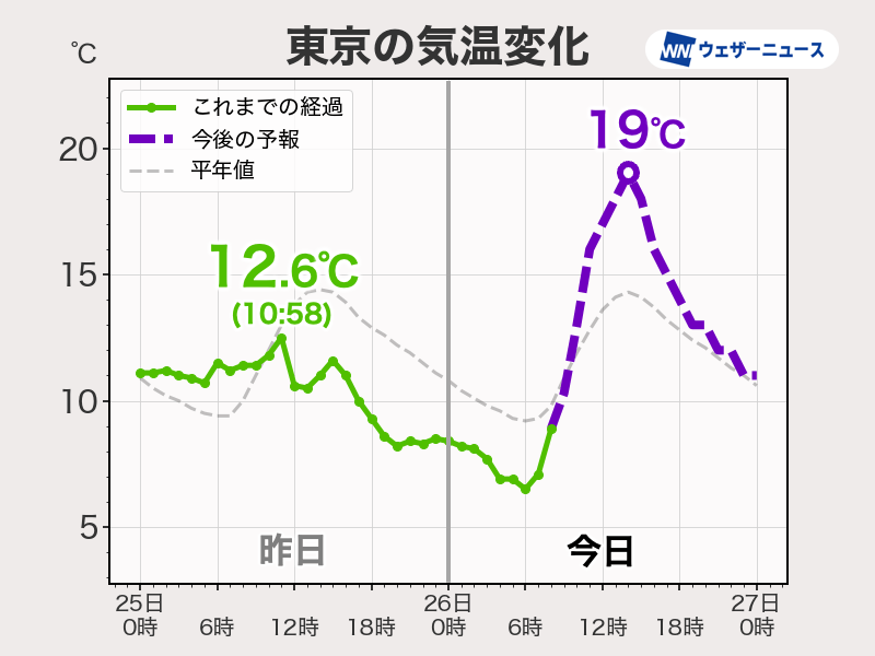 東京都心は、昨日は冷たい雨の影響で気温がほとんど上がりませんでした。最高気温は10時58分に観測した12.6℃と、12月上旬並みの寒さになりました。