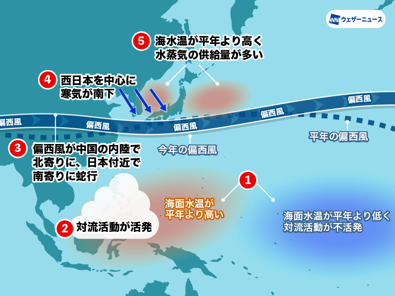 今冬の降雪量は日本海側で平年並〜多い予想 偏西風の蛇行と海水温の高さが影響