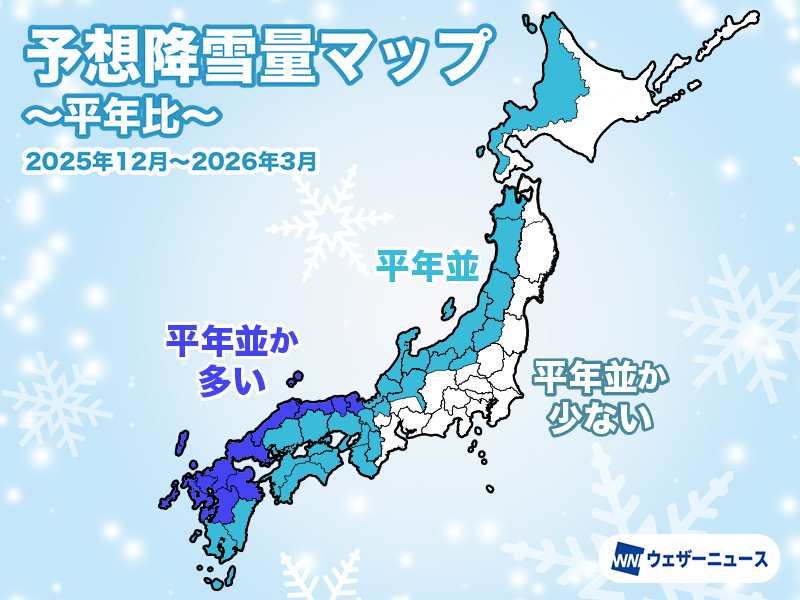 雪のピークは、北日本日本海側で2月上旬〜中旬、北日本太平洋側では2月中旬で、低気圧や強い寒気の影響を受けやすい予想です。東日本日本海側では年末年始と1月末〜2月初め、西日本では1月末〜2月初めの予想です。これらの時期は冬型の気圧配置が強まって強い寒気が南下しやすい見込みです。