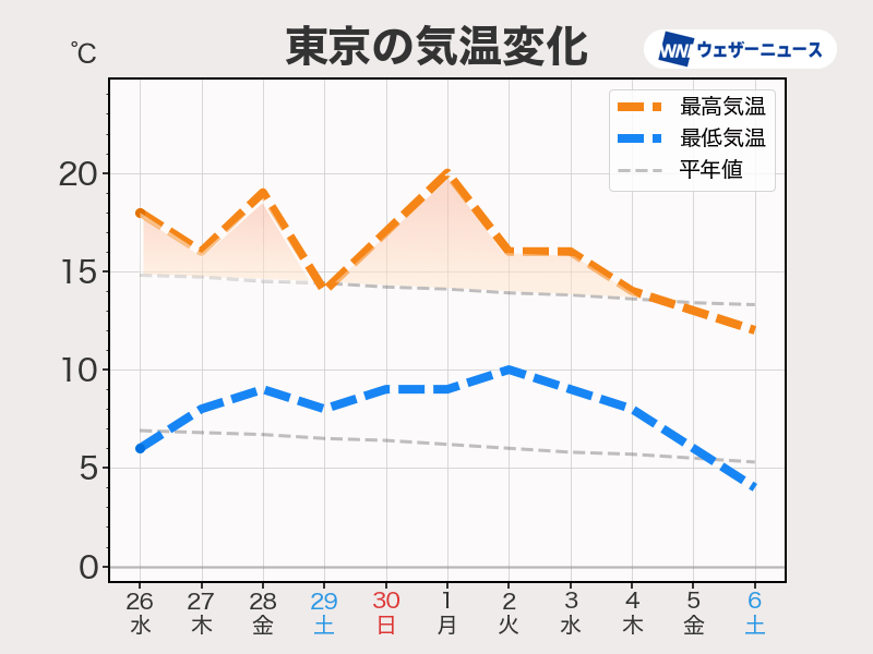 放射冷却現象などの影響で、朝晩は冷え込む日が多くなるので、一日の気温差に注意が必要です。