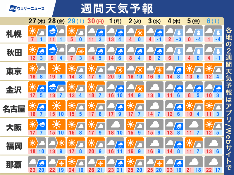 この先一週間ほどは寒気の流れ込みが弱く、昼間は比較的過ごしやすい陽気となる日が多くなる見込みです。