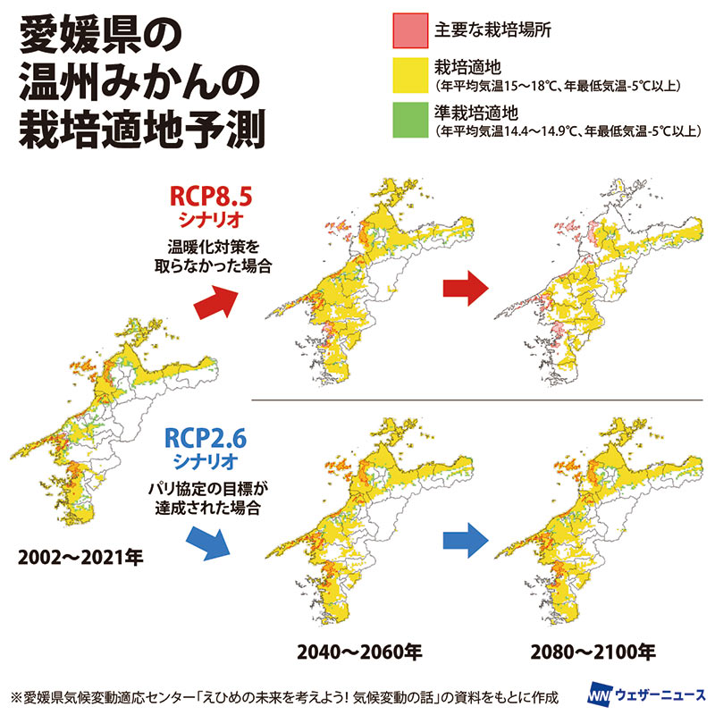 全国的に長い間みかん栽培の適地であった地域が、温暖化の影響で移動する可能性があるとされています。和歌山県・愛媛県でも現在の主な栽培地域が将来の栽培適地とはずれる心配があります。