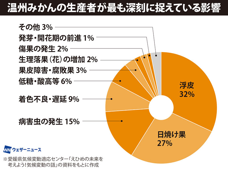 また、今年記録的な高温が注目されたように、近年は高温が珍しくなくなってきています。それらの影響によるみかんの「浮皮果(うきかわか)」「日焼け果」の増加が問題となっています。