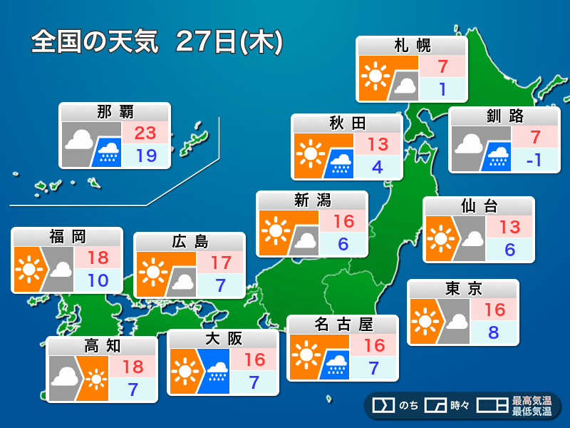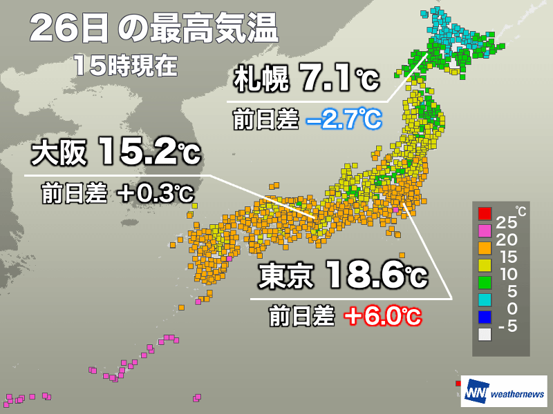 一方、寒気が流れ込んだ北日本や北陸は、昨日より気温の下がった所が多くなりました。また、北寄りの冷たい風が吹き付けて雲が広がった近畿も、寒さを感じた方が多くなりました。