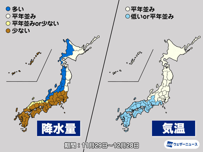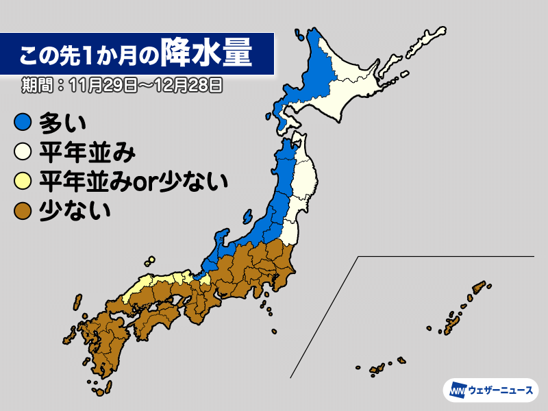 この先1か月は低気圧の影響を受けやすく、冬型の気圧配置が強まりやすい時期がある見通しです。このため、北日本・東日本の日本海側では降水量が平年より多くなるとみられます。