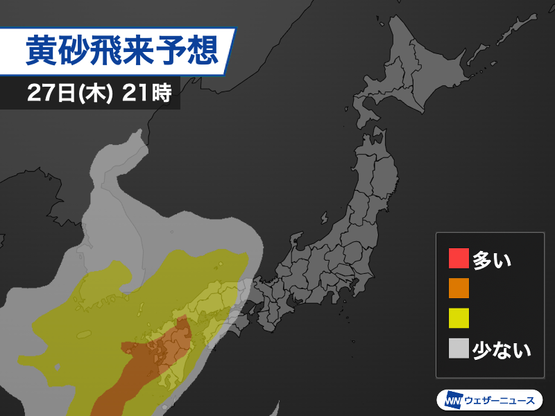 ウェザーニューズ予報センターの見解では、今夜から西日本へ飛来する見通しで、空が霞む等の影響が出る可能性があります。夜間で感じにくいかもしれませんが、呼吸器などの疾患がある方は症状が悪化するおそれがありますので、28日(金)にかけて黄砂の動向に注意してください。