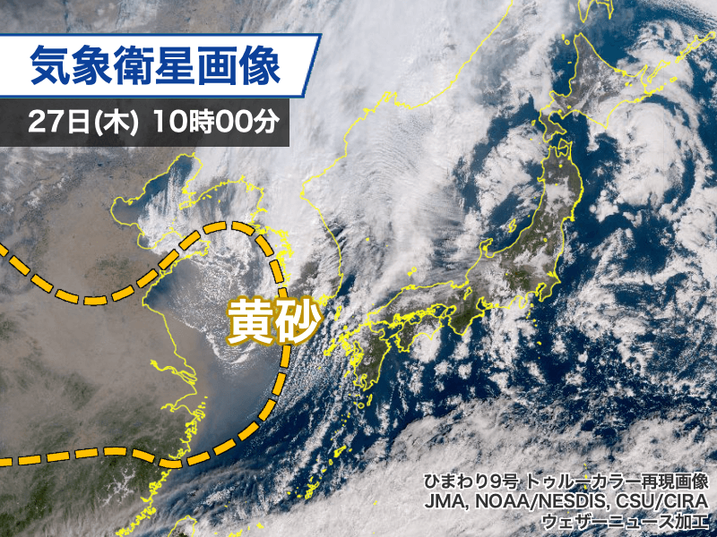 昨日26日(水)にゴビ砂漠の南に滞留していた黄砂が南東進してきました。中国・華東では視程が5〜10kmという報告が多く、一部では2〜5kmまで下がっています。気象衛星画像でも、山東半島から華東、黄海付近にはっきりと黄砂が確認できる状況です。