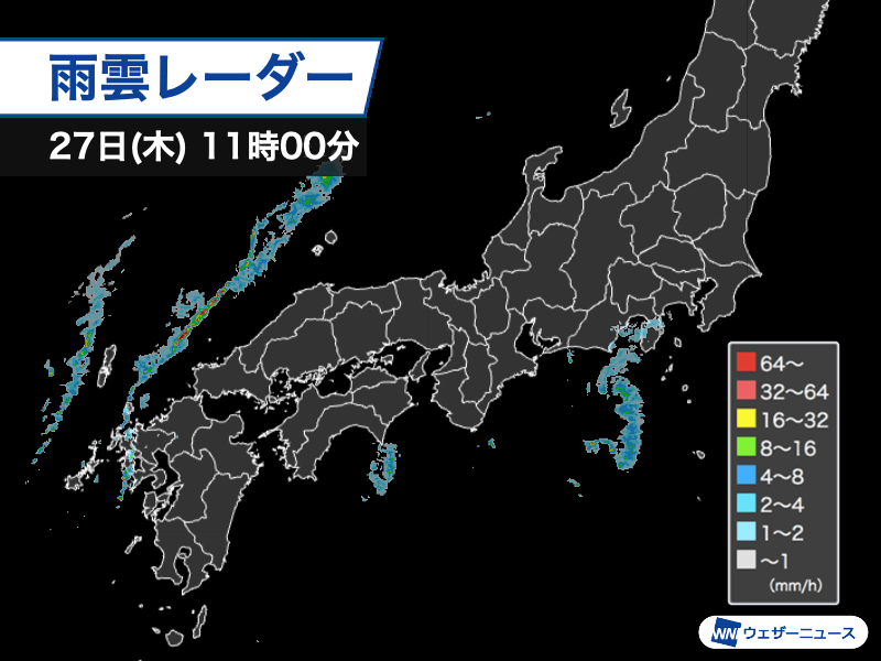 西日本日本海側には寒冷前線に伴う雨雲が、太平洋側にはシアライン(風の流れが変化する境界線)に伴う雨雲が複数現れています。これらに近い九州北部や四国太平洋側、静岡県付近で雨が降っている状況です。