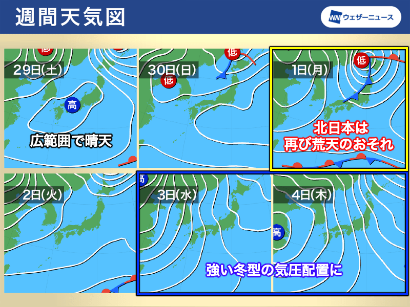 低気圧は、29日(土)にはオホーツク海に離れていきます。今回の荒天は長くは続かない予想です。ただ、その後も北海道には断続的に低気圧が接近し、12月1日(月)は再び荒天となるおそれがあります。
