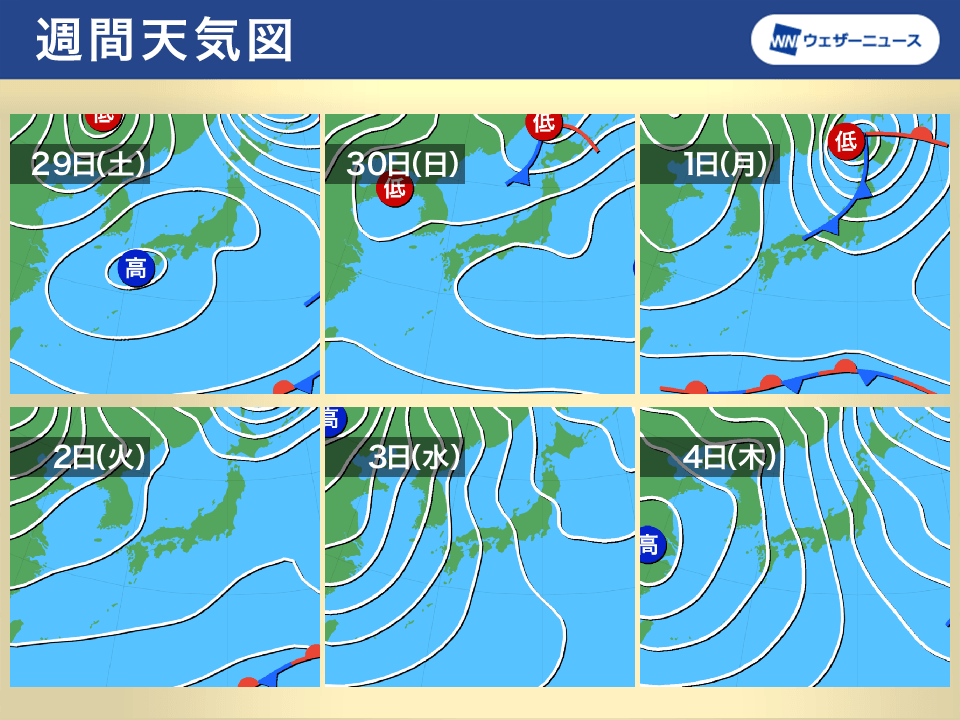 30日(日)は日本海の前線上で発生する低気圧が北日本を通過し、北海道の山沿いでは大雪となるおそれがあります。沿岸部を中心に風も強まり、荒れた天気となる可能性があります。