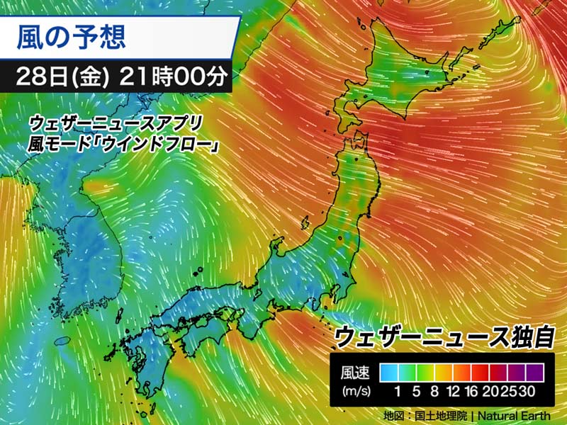 北日本や東日本では風も強く吹き、宮城県女川町では14時過ぎに最大瞬間風速24.2m/sを観測しています。