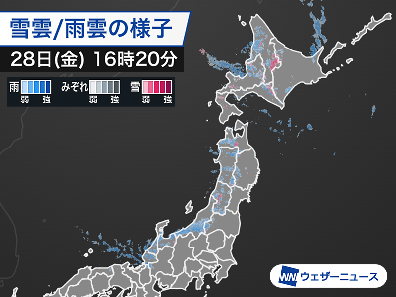 今日28日(金)は低気圧が発達しながらオホーツク海方面に進み、日本付近は一時的な冬型の気圧配置になっています。道東の雨はピークを越えましたが、北陸から北の日本海側では断続的に雨が降っています。大気の状態が不安定で、所々で雷も鳴っています。
