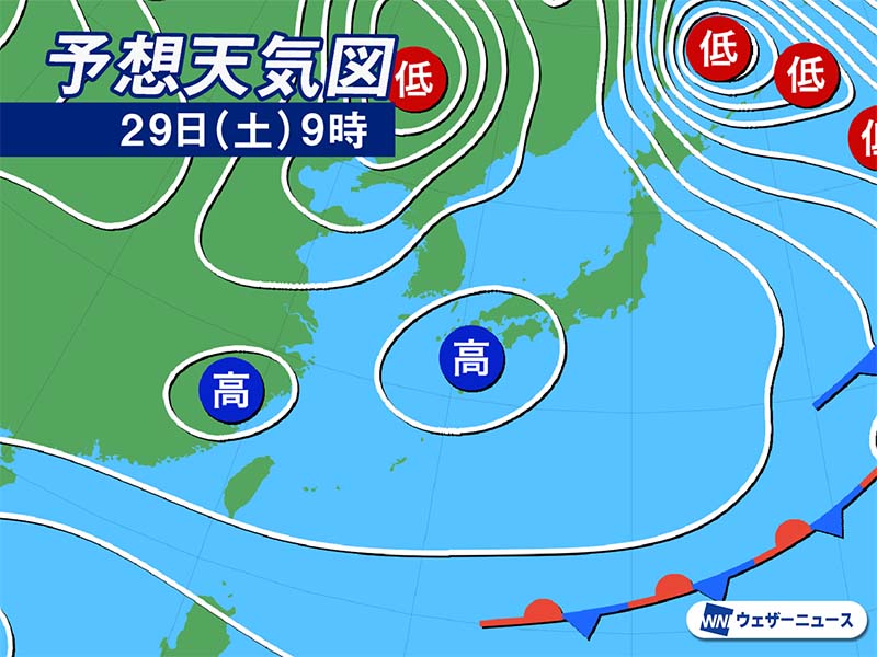 移動性高気圧に広く覆われる西日本や東日本は、穏やかな晴天になります。雨の心配はほとんどありません。