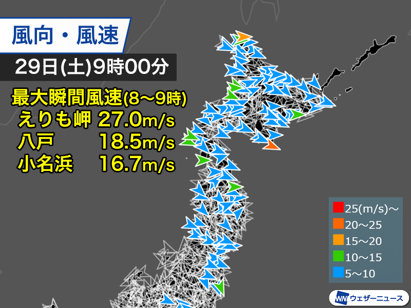 8〜9時の1時間に観測された最大瞬間風速は、北海道えりも町・えりも岬で27.0m/s、青森県八戸市で18.5m/s、福島県いわき市・小名浜で16.7m/sとなっています。
