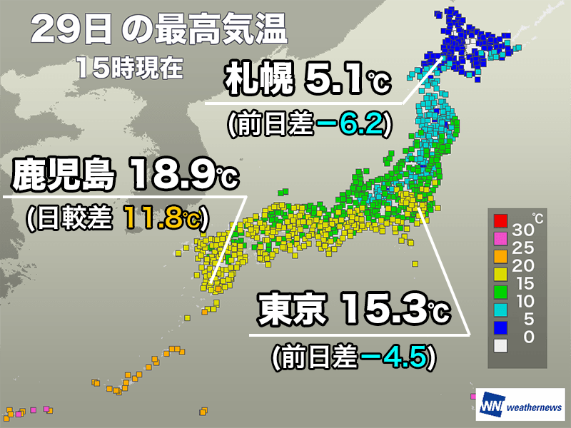逆に寒気の影響が大きくなった関東や北日本は昨日に比べて気温が低くなっています。北海道は昨日より日差しが多くなっても気温が上がらず、札幌市は6.2℃低い5.1℃、東京都心は4.5℃低い15.3℃です。