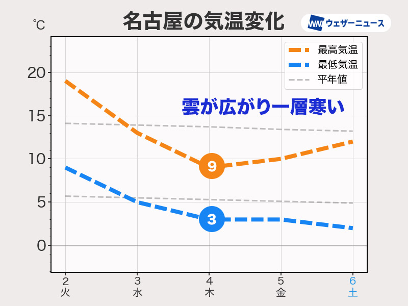 4日(木)の名古屋の最高気温は9℃くらいとなり、雲が広がりやすいこともあって一層寒く感じそうです。