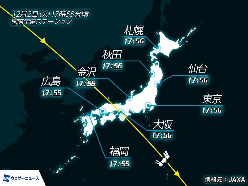 関東や山陰、九州南部などは雲が広がるところが多いものの、雲の隙間からISSを観察できるかもしれません。