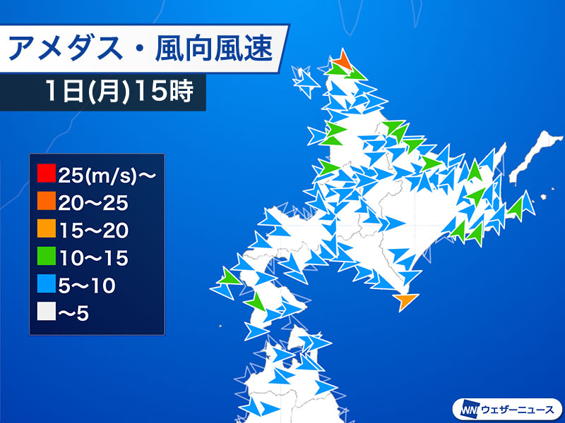 15時現在、北海道の道北や道央に暴風警報の発表されているところがあります。北海道では道北のピークを超えつつありますが、道東方面では夕方にかけても最大瞬間25m/s前後の強風に注意が必要です。