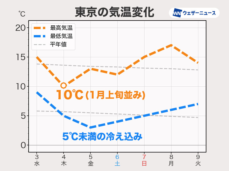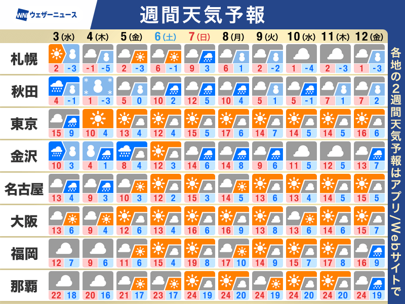 その後は寒さが緩み、週明けにかけて平年よりも気温が高めになる予想です。短い期間で気温変化が大きくなるため、体調管理に十分ご注意ください。