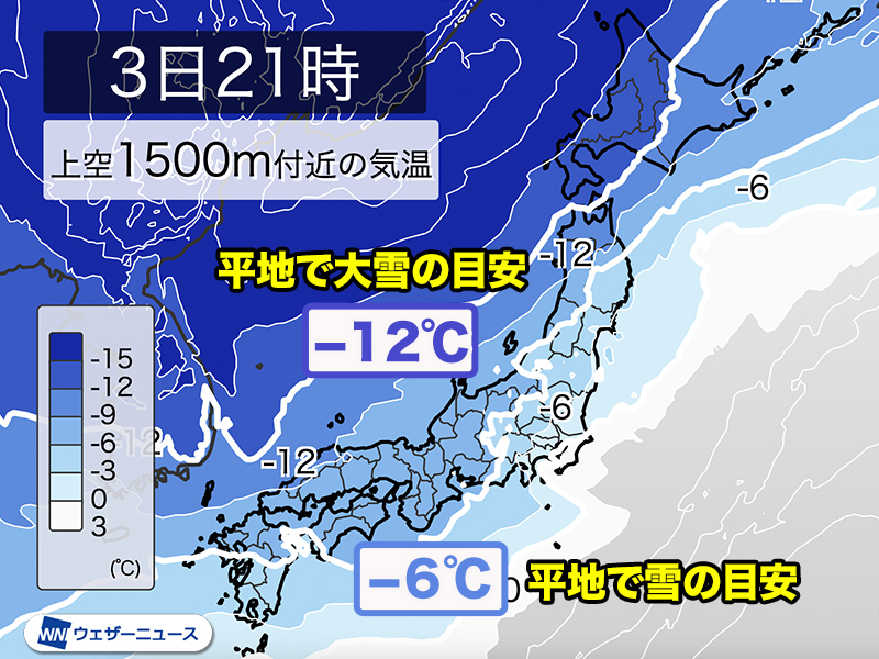 3日(水)午後から4日(木)にかけて寒気の南下のピークとなり、上空1500m付近で−6℃のラインが西日本、東日本の太平洋側まで南下する見込みです。北海道付近はさらに強い−12℃以下の寒気に覆われます。さらに上空約5500m付近で-36℃以下の寒気が北日本上空を通過する予想です。