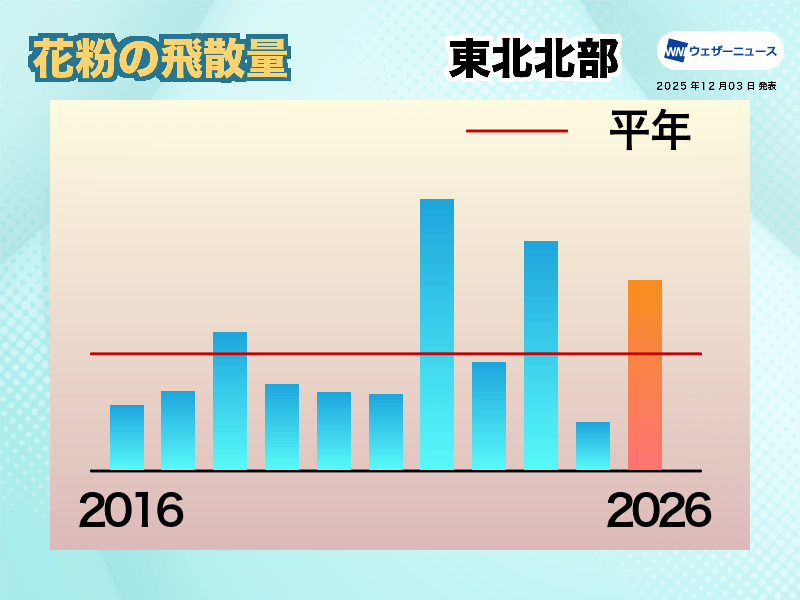このため、2026年は前年の反動で飛散量が多くなる「表年」になり、飛散量は2025年比で126%、平年比で121%になる見込みです。