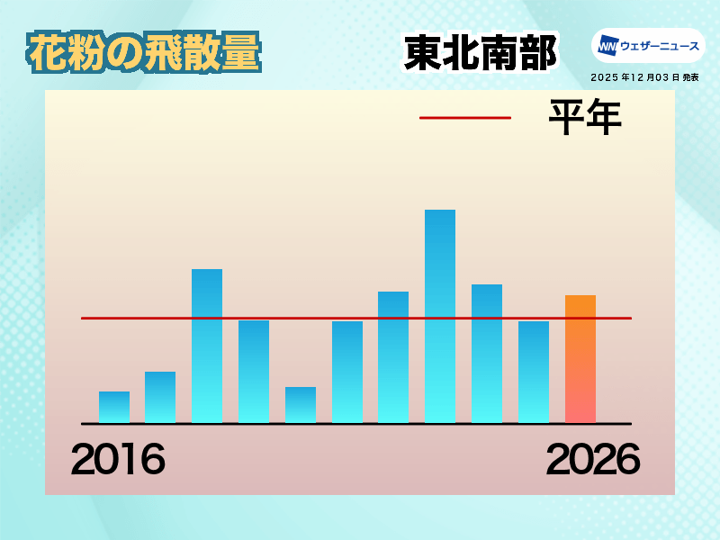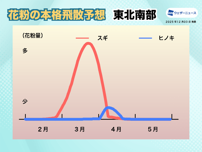 特に晴れて風が強い日には大量の花粉が飛散するため、しっかりと花粉対策を行ってください。また、東北南部ではスギ花粉が中心で、ヒノキ花粉は比較的少ない傾向にあります。