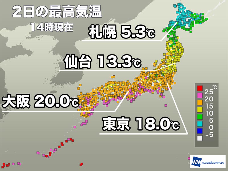 今日2日(火)14時までの最高気温は、旭川4.1℃、札幌5.3℃、秋田12.8℃、仙台13.3℃でした。北日本は暖かかった昨日より5℃以上低いところが多く、特に北海道は冬の寒さが戻っています。