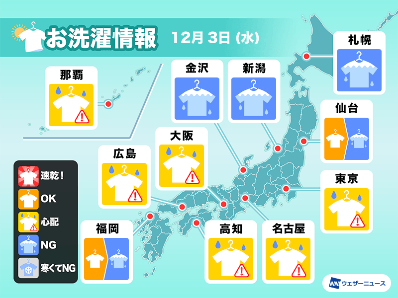 太平洋側は日差しが届く可能性はあるものの、スッキリとしない雲優勢の空となるところがほとんどです。にわか雨の可能性があるため、外干しはしない方が良さそうです。外干しをする場合は空の様子をよくみつつ、沿岸では風も強まるためしっかりと留めるようにしてください。