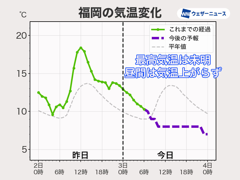 また福岡では最高気温は未明に既に観測されていて、昼間は気温が右肩下がりとなります。最高気温の数字以上に寒い一日となりますので、油断せず万全な防寒を心がけてください。