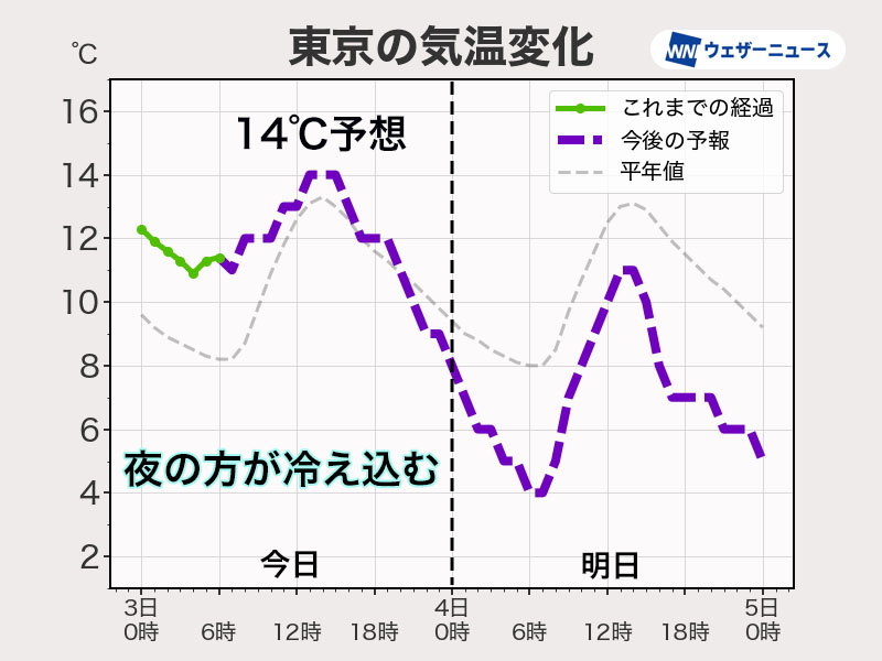 比較的寒気の影響が小さい関東も、日差しの温もりが乏しく昼間もヒンヤリと感じられそうです。最高気温は東京・さいたま・千葉などで14℃、水戸で12℃の予想です。また、夜はグッと冷え込んでくる見込みです。