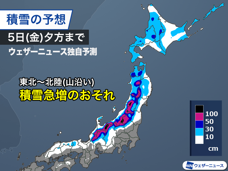 北日本の各地と日本海側では、上空に強い寒気が南下している影響で雪や雨が降る見込みです。特に東北から北陸の山沿い激しい雪となり、積雪が急増するおそれがあります。
