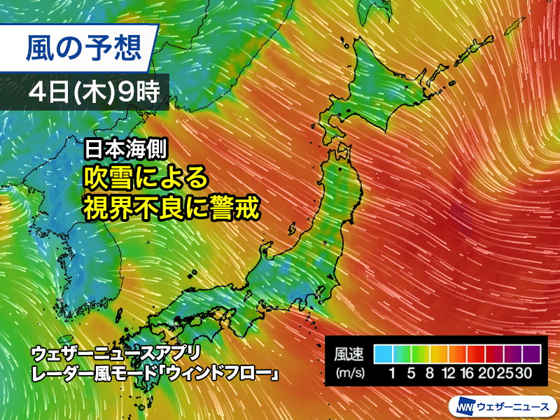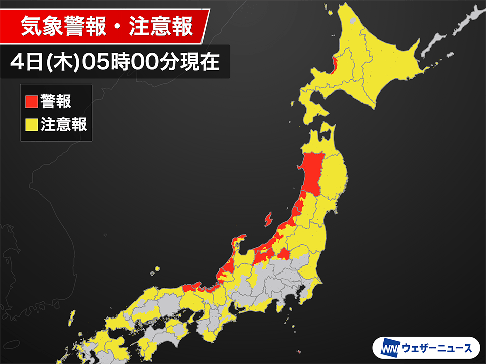4日(木)5時の時点で、北海道や東北、群馬、長野などの各地に暴風雪警報や大雪警報が発表されています。北陸などには波浪警報が発表されています。