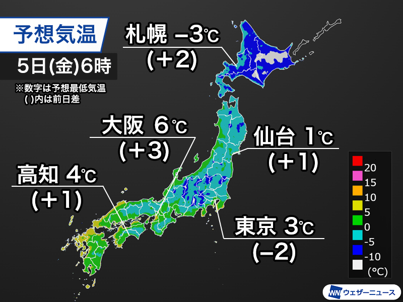 今夜から明日5日(金)の朝にかけては、寒気の影響が少し小さくなる一方で、晴れる地域では放射冷却現象が強まります。