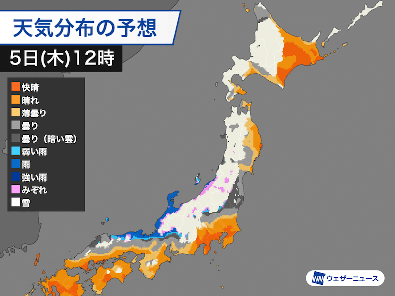 特に北陸地方では、日本海で発生した低気圧の接近に伴い、雷や霰(あられ)を伴った強い雨や雪が降る可能性があります。気温はあまり上がらず、寒さが続く予想です。