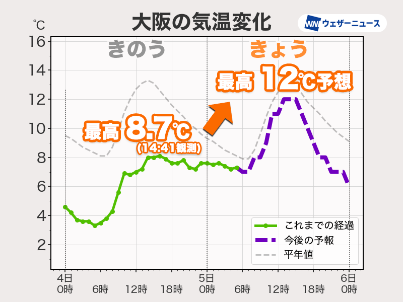 昼間は昨日に比べると気温が上昇し、最高気温は10℃から15℃くらいまで上がる見込みです。ただ、朝晩はまだ冷え込むため、衣服の調節には注意が必要です。