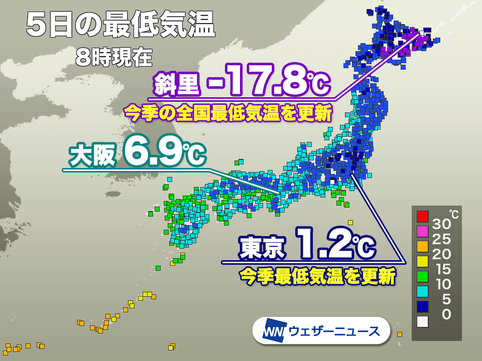 また、東日本や西日本では今季一番の冷え込みとなったところが多く、東京都心(1.2℃)、名古屋(2.2℃)、大阪(6.9℃)など186地点で今季最低気温を更新しています。内陸部では氷点下となった地点もありました。