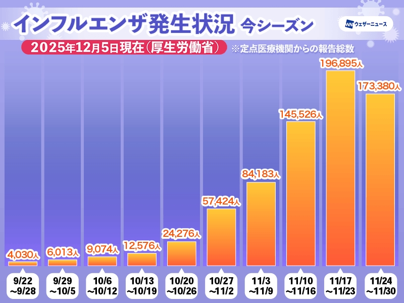 今週は、患者数が減少したものの、例年インフルエンザは年末にかけて発生数が多くなる傾向にあり、今後も患者数が増加する可能性があり引き続き注意が必要です。朝晩と昼間の体感差が大きく、体調を崩しやすくなると見られます。服装や寝具を上手に調節しつつ、日頃から体調管理にお気をつけください。