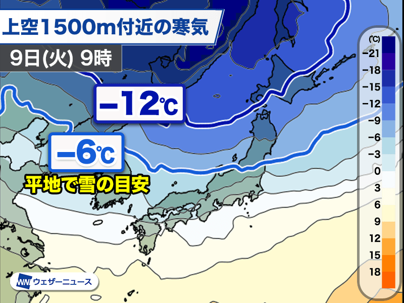 低気圧の通過後、8日(月)夜から9日(火)にかけて冬型の気圧配置となり、上空には寒気が流れ込みます。雪や風の強まりに注意が必要です。
