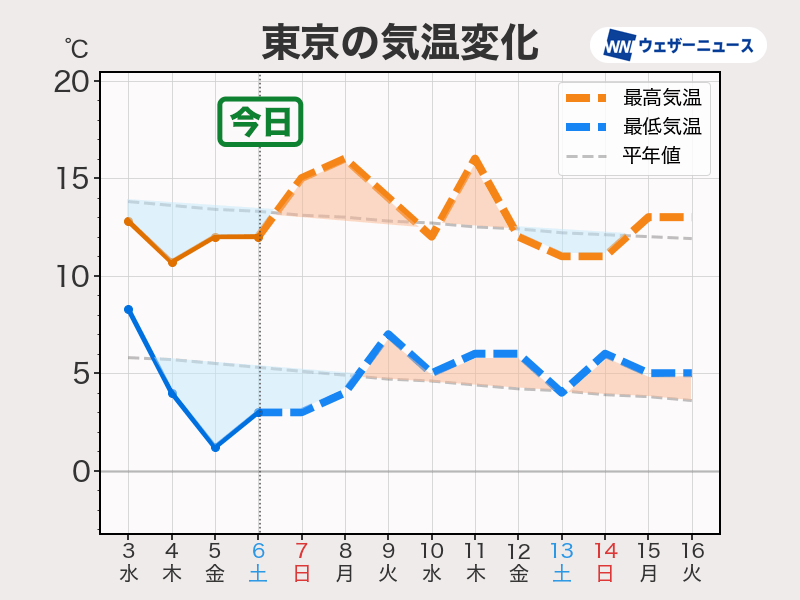 明日7日(日)頃からは冬の寒さは緩みます。寒気が流れ込むタイミングで気温の下がる日はあるものの、平年より気温の高い日が多い予想です。