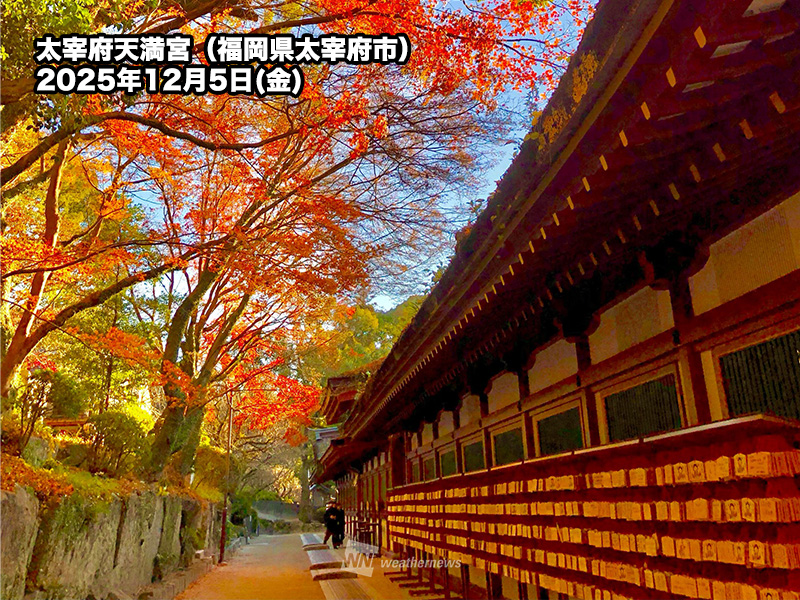 写真は昨日5日(金)の太宰府天満宮の紅葉の様子です。太宰府天満宮の紅葉の見頃は例年11月中旬~12月上旬頃で、カエデやイチョウが色づく紅葉の名所です。現在7〜8割が色づき、見頃を迎えています。
